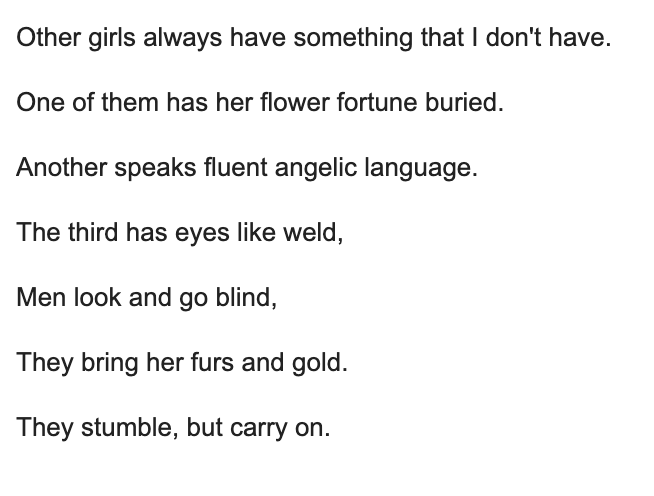 Poetry Here Magazine Poem of the Long TongueThanks to editor Ruslan Komadey Photograph by Alex Cassetti Writer’s Block Homosexual Gene, a diptych (Page 20)Photograph by Julia Kaczmarek Russian Oppositional Arts Review Sister Languages - a selection of poems Indelible Gunshot and “Of glass”, two poems F-Writing American Poetry, a selection of poems Textura Dead Knot, a selection of poems Polutona Secondary SubjectPhotograph by Ann Shteyner 45 Parallel Girl under the Bank - a selection of poems